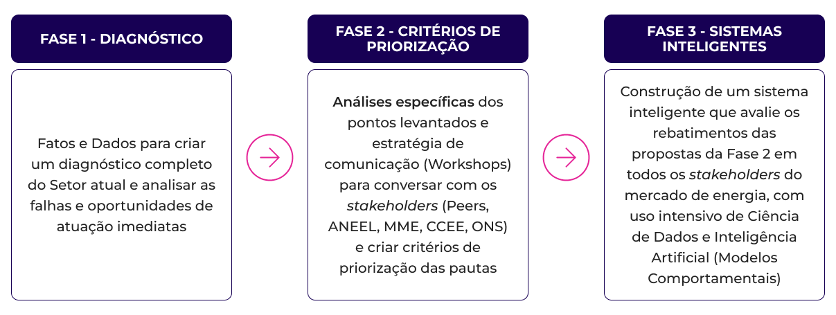 “O projeto realizará um diagnóstico completo do setor elétrico atual, avaliando falhas e oportunidades de atuação. Seguiremos então para as análises específicas dos pontos levantados e a priorização dos temas, para então desenvolver um sistema inteligente que consiga avaliar o rebatimento das propostas em cada um dos stakeholders do mercado, utilizando inteligência de dados e IA.”